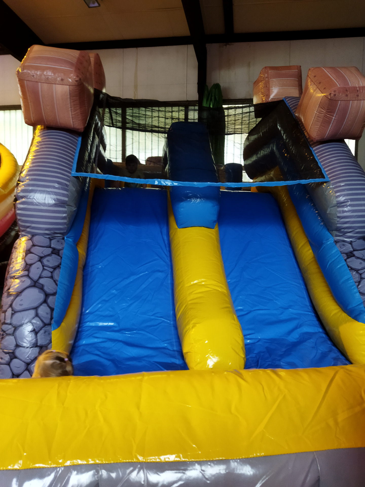 Dinosvět nabízí uprostřed k překonání pořádný kopec, po zdolání jsou navýběr dvě skluzavky vlevo a vpravo... Rozměrově jako Bombon...takže žádný drobek.